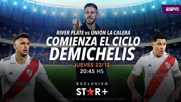 Este jueves 22 de diciembre, desde las 21.15, River y Unión La Calera se verán las caras en territorio argentino.Y los que no puedan estar presentes allí deberán sentarse frente a cualquier tipo depantallapara mirar el partido a través de la plataforma Star+, que será la encargada de la transmisión en vivo.