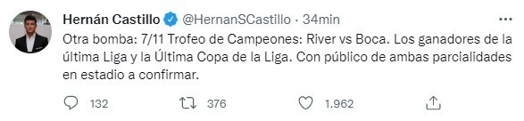 La información surgió a través de una publicación del periodista Hernán Castillo que si bien en su cuenta de Twitter se refirió al Trofeo de Campeones, en realidad se estaba refiriendo a la Supercopa Argentina. Por otro lado en su momento en la página oficial de la AFA había aparecido que River y Boca se enfrentarían por la Supercopa Argentina el 16 de marzo, pero eso finalmente quedó en la nada.