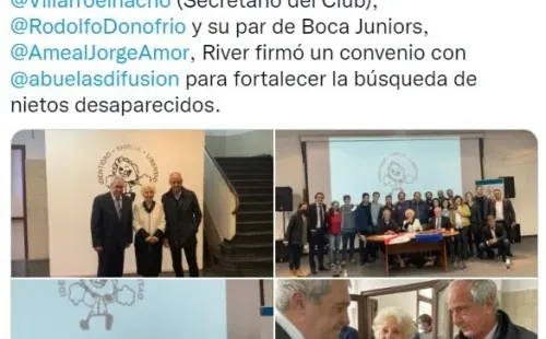 “Uno en la vida tiene una posición tomada y es el compromiso con los derechos humanos y la búsqueda de los nietos. Como argentinos tenemos que estar juntos siempre. Para bien del fútbol, para causas como estas, tenemos que estar siempre“, aseguró el máximo mandatario del Millonario en el acto celebrado y luego concluyó: “Nosotros somos dos locomotoras. Y estas dos locomotoras tienen que estar con el pueblo, para lograr una mejor sociedad”.