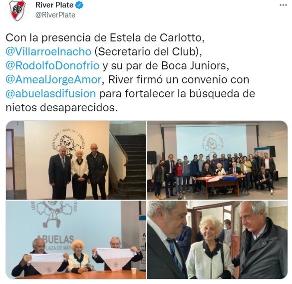 Y si de difusión hablamos, River y Boca son los dos clubes más populares del país, es por eso que es sumamente importante que se unan para realizar campañas para terminar de encontrar a los nietos que fueron apropiados, entregados por genocidas. Rodolfo D’Onofrio y Jorge Amor Ameal fueron invitados al edificio de Abuelas en el Espacio Memoria y Derechos Humanos (donde antes funcionaba la ESMA) y fueron recibidos por Estela de Carlotto, quien les entregó un pañuelo blanco, símbolo tanto de las Abuelas como de las Madres de Plaza de Mayo. La intención fue reafirmar el compromiso de ambos clubes para que se puedan encontrar a los 300 nietos que faltan.