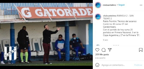 Marcelo Gallardo despierta admiración en general, lógicamente los hinchas de River lo aclaman e idolatran, pero el mundo del fútbol le reconoce su extraordinario trabajo como director técnico y la inmensa mayoría busca tener contacto con él ya sea para saludarlo, para cruzar unas palabras o simplemente para demostrarle su respeto. El pasado 9 de septiembre, cuando Argentina recibió a Bolivia por las Eliminatorias Sudamericanas en el Monumental, Marcelo Gallardo se reencontró con un viejo compañero de River que actualmente se desempeña como director técnico de San Telmo: Pablo Frontini.