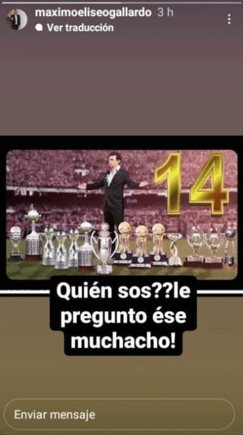 Máximo Gallardo, papá del Muñeco, no pudo evitar la calentura después de ver o escuchar los dichos de Beccacece para con su hijo e hizo un picante posteo en su cuenta de Instagram. “Quién sos?? le preguntó ese muchacho”, escribió, seguido de una foto de Gallardo con sus 14trofeos en el Más Grande, justo cuando se cumplen ocho años de su asunción como DT del equipo. Parece que Beccacece se ganó varios “enémigos” en el Millonario después de este episodio…