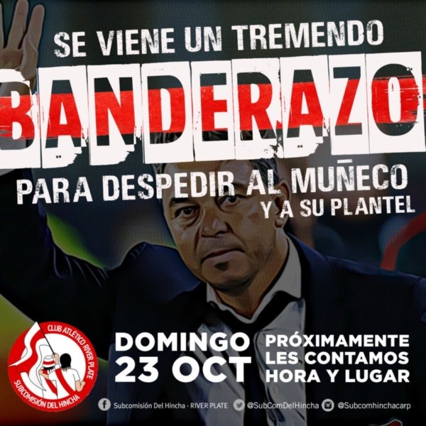 “Se viene el último banderazo del año y también, el último que va a tener al Muñeco como DT. Parece mentira que después de tantos años, haya llegado el momento de despedir a nuestro técnico más ganador, al que mejor nos representó, al que nos dio la gloria eterna. Los esperamos el domingo, con lugar y horario a confirmar en estos días. Trae tu remera, tu bandera, tu cartel, globos y papelitos para despedir al Muñeco”, comunicó la Subco del Hincha a través de sus redes oficiales.