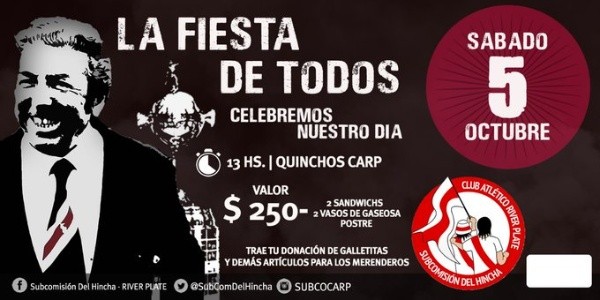 Como ya es habitual cada año, la Subcomisión del Hincha llevará adelante la organización de los festejos en los quinchos del club. ¿Cuándo será la fiesta? El próximo sábado 5 de octubre desde las 13 horas. Cabe recordarque justamente el sábado 28 Riverdisputa una nueva fecha de la Superliga, ante Gimnasia en La Plata, y es por esto que se decidió postergar la convocatoria una semana más.