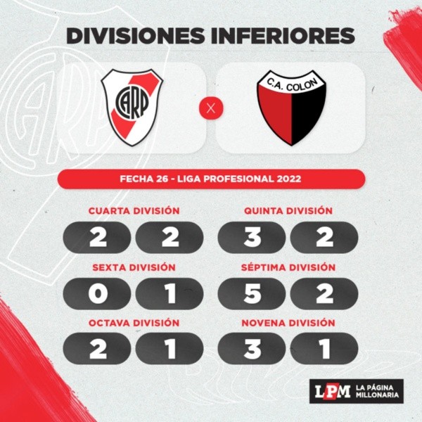 Por su parte, la Octava División es la otra categoría que llega con chances intactas de poder celebrar el título. Este sábado venció a Colón 2 a 1 y se mantuvo en lo más alto de la tabla de posiciones junto a Independiente, que también ganó su encuentro (2-0 frente a Argentinos Jrs.). Ambos llegan a la última jornada con 60 unidades y se enfrentarán entre sí para definir el campeón. El encuentro tendrá lugar en el predio que el Rojo posee en Domínico.