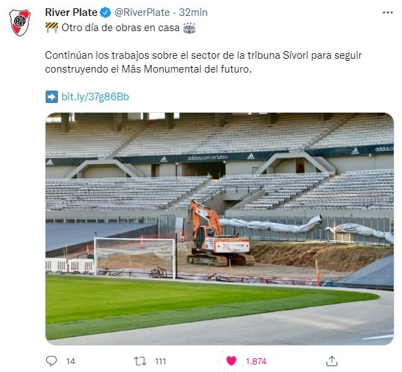 Este martes el club mostró cómo siguen los trabajos, en esta oportunidad una excavadora estaba acondicionando el sector bajo de la tribuna Sívori y dejando todo listo para que en unas semanas ya se comience la construcción de la Sívori Baja inferior. Hay que recordar que con la reestructuración de las ubicaciones del Monumental ese sector pasará a ser popular, de igual manera que la Centenario Baja, por lo que el anillo superior –donde actualmente están las populares- será íntegramente de plateas.