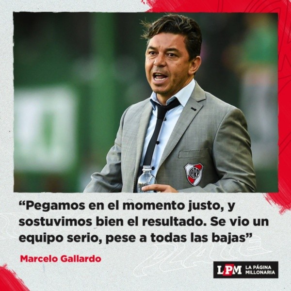 En conferencia de prensa, Marcelo Gallardo analizó el triunfo y el rendimiento de su equipo: “Fue un partido muy trabajado, en un terreno muy difícil, contra un rival muy físico también. Estamos muy contentos porque no era fácil después de la efervecencia del triunfo contra Boca, con tantas bajas en el equipo, teníamos que armar el mejor equipo posible para jugar en esta cancha difícil, pero trabajamos bastante el partido y pegamos en el momento justo“.