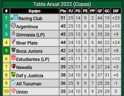 Los tres primeros de la tabla anual serán los que se clasifiquen a la Libertadores 2023, donde ya está Boca por haber ganado la Copa de la Liga y donde también irá el campeón de la actual Liga Profesional (y el de la Copa Argentina). Mientras que los seis siguientes en la suma de ambos torneos disputarán la Copa Sudamericana 2023.