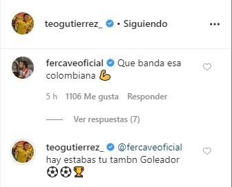 Teo a menudo muestra su vínculo con River. Más allá de su paso por Núñez, su fanatismo por la banda roja hace que siempre tenga tiempo para refrescar esos momentos vividos en el club. Y esta vez lo hizo para mostrarse junto a otros dos colombianos y el trofeo del Torneo Final 2014, el que consiguieron de la mano de Ramón Díaz. Uno de los campeones que comentó la foto fue Fernando Cavenaghi. “Qué banda esa colombiana”, escribió el Torito y Teo enseguida le contestó: “Hay (sic) estabas tu también, goleador”.