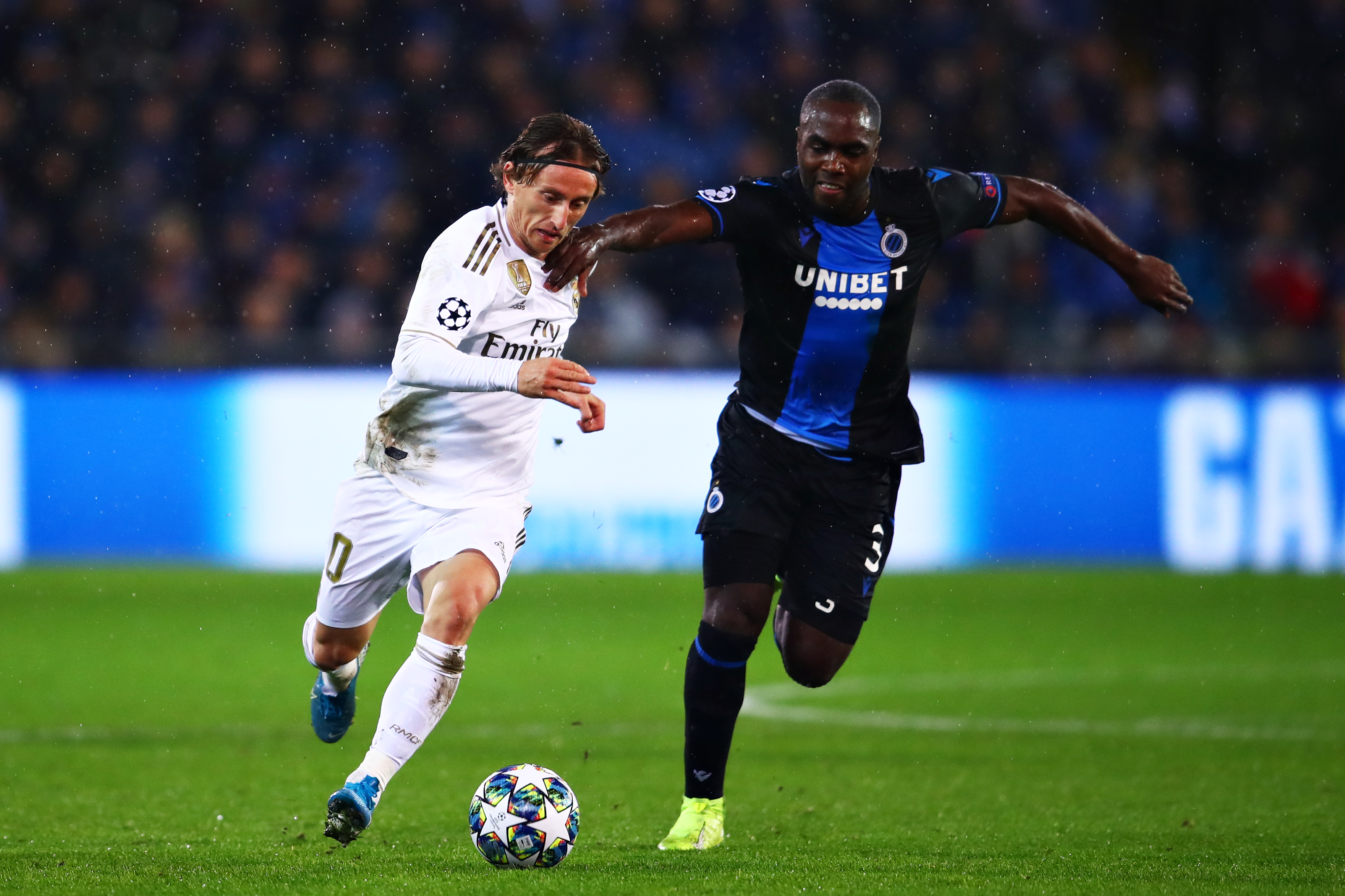El marcador central con la camiseta del Brujas marcando a Modric, en un partido de Champions League.