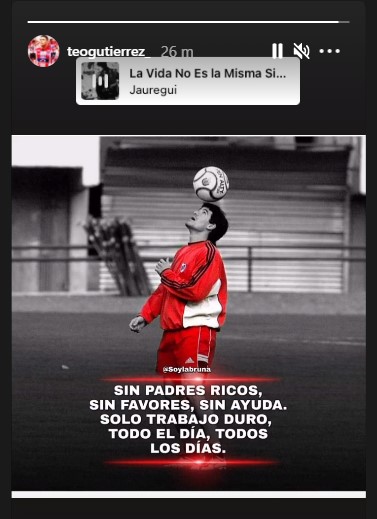 Teófilo Gutiérrez dejó un gran recuerdo en los hinchas del Más Grande, si bien su salida fue algo desprolija, en el balance general su paso por Núñez fue más que positivo, jugó muchos partidos, apareció en los importantes, convirtió goles y dio algunas vueltas olímpicas. En su cuenta de Instagram compartió una foto de Ariel Ortega en su etapa como futbolista de River con la ropa de entrenamiento e hipnotizado con la pelota con la frase “Sin padres ricos, sin favores, sin ayuda. Solo trabajo duro, todo el día, todos los días”, haciendo clara referencia al origen del Burrito, que fue muy humilde y que supo tocar el cielo con las manos gracias a su esfuerzo y su talento incomparable. A esta historia la acompañaba la canción La vida no es la misma sin fútbol del cantante mexicano Jauregui.