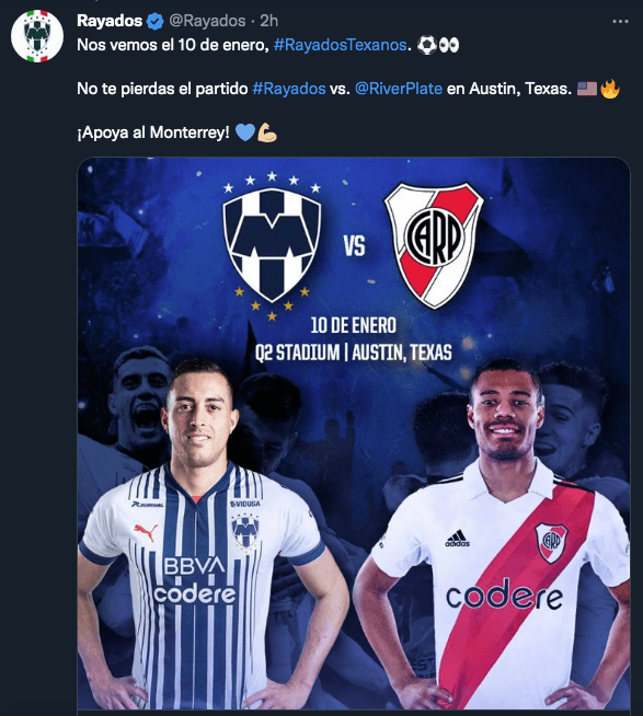 En su cuenta de Twitter, los Rayados anunciaron el encuentro frente al Más Grande con un poster en el que están Rogelio Funes Mori por parte del club mexicano y Nicolás De la Cruz por parte de River. La cita quedó pactada para el 10 de enero en el Q2 Stadium de Austin, en Texas. Además de Funes Mori, en el conjunto norteamericano también actuará seguramente Matías Kranevitter, un hijo de la casa riverplatense.