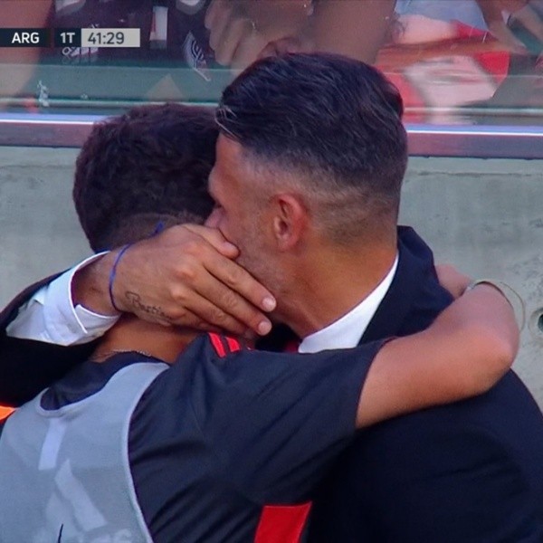 Bastian fue uno de los alcanzapelotas en el encuentro ante Argentinos Juniors y antes de que inicie el partido, Demichelis se levantó del banco de suplentes con una sonrisapara darle un abrazo a su pequeño y susurrarle algo al oído.