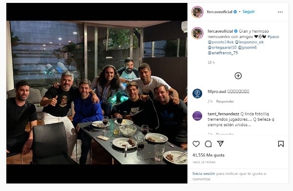 Este miércoles por la noche, varios ex River se juntaron para disfrutar del debut del equipo del Muñeco en la Copa Libertadores. Se trato de una reunión entre amigos, colegas y en algunos casos, ex compañeros, que dejó de ser una cuestión íntima una vez que Fernando Cavenaghi posteó en su cuenta de instagram una imagen del cónclave millonario.