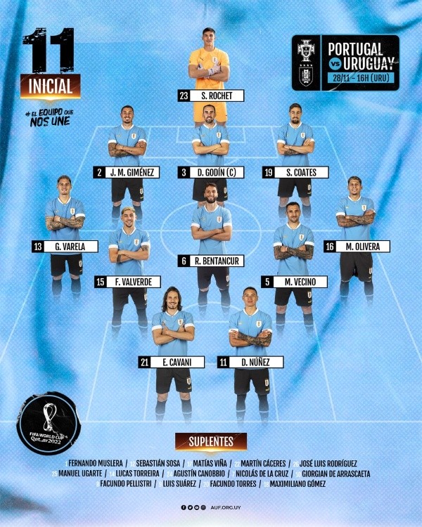 ¿Los once de La Celeste?Sergio Rochet; Guillermo Varela, Diego Godín, Jose María Giménez, Sebastián Coates, Matías Olivera; Federico Valverde, Rodrigo Bentancur, Matías Vecino; Darwin Núñez y Edison Cavani.