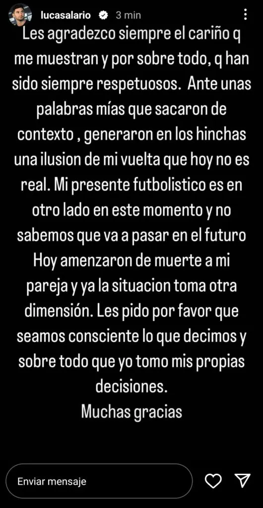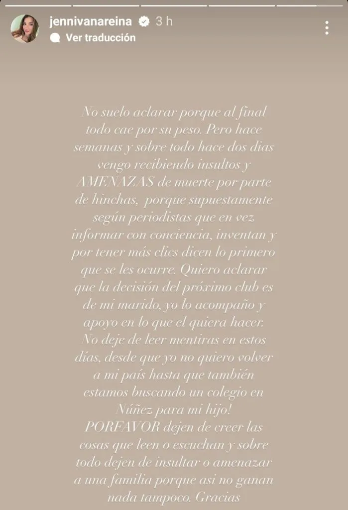 “No suelo aclarar porque al final cae todo por su propio peso. Pero hace semanas y sobre todo hace dos días que vengo recibiendo insultos y AMENZAS de muerte por parte de hinchas, porque supuestamente según periodistas que en vez de informar con conciencia, inventan y para tener más clics dicen lo primero que se les ocurre. Quiero aclarar que la decisión del próximo club es de mi marido, yo lo acompaño y lo apoyo en lo que él quiera hacer. No dejé de leer mentiras en estos días, desde que yo no quiero volver a mi país hasta que estamos buscando colegio en Núñez para mi hijo! POR FAVOR dejen de creer las cosas que leen y escuchan y sobre todo dejen de insultar o amenazar a una familia porque así no ganan nada tampoco. Gracias”, escribió la esposa de Manuel Lanzini en su cuenta de Instagram.