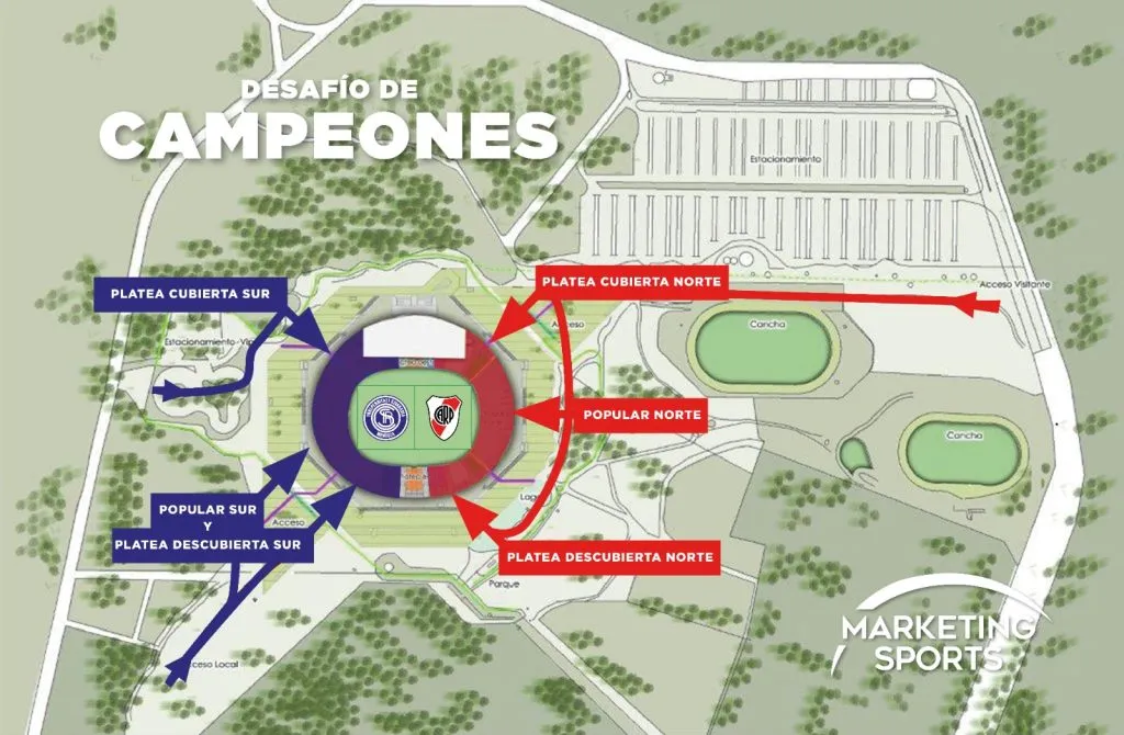 Con tres sectores a disposición: la platea norte cubierta, la norte descubierta y la popular norte, los hinchas de River que asistan al amistoso de esta noche ingresarán por la Avenida, pasarán por la calle que se ubica entre el Estadio de Hockey y el Aconcagua Arena para llegar así a los ingresos.