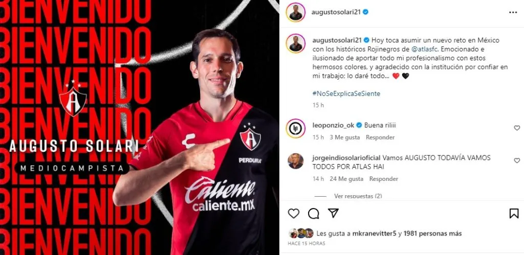 “Hoy toca asumir un nuevo reto en México con los históricos Rojinegros de Atlas. Emocionado e ilusionado de aportar todo mi profesionalismo con estos hermosos colores, y agradecido con la institución por confiar en mi trabajo; lo daré todo“, fueron las palabras que manifestó Solari en su cuenta de Instagram, quien se encuentra muy entusiasmado por este nuevo desafío.