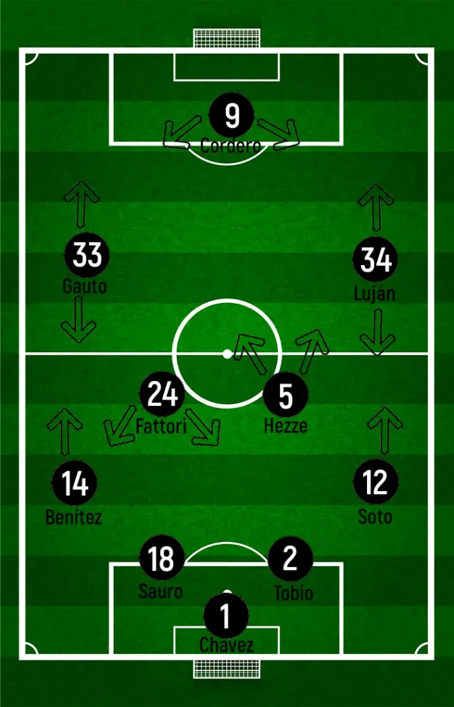 Ya en el final, Demichelis efectuó varios cambios, buscando regular desgastes del equipo y darle minutos a jugadores como Simón y Suárez. Así, en cancha terminó siendo un 4-3-1-2 con Matías en el mismo rol de mediapunta que Beltrán hacía en el primer tiempo y Paradela cerrándose de izquierda al medio.