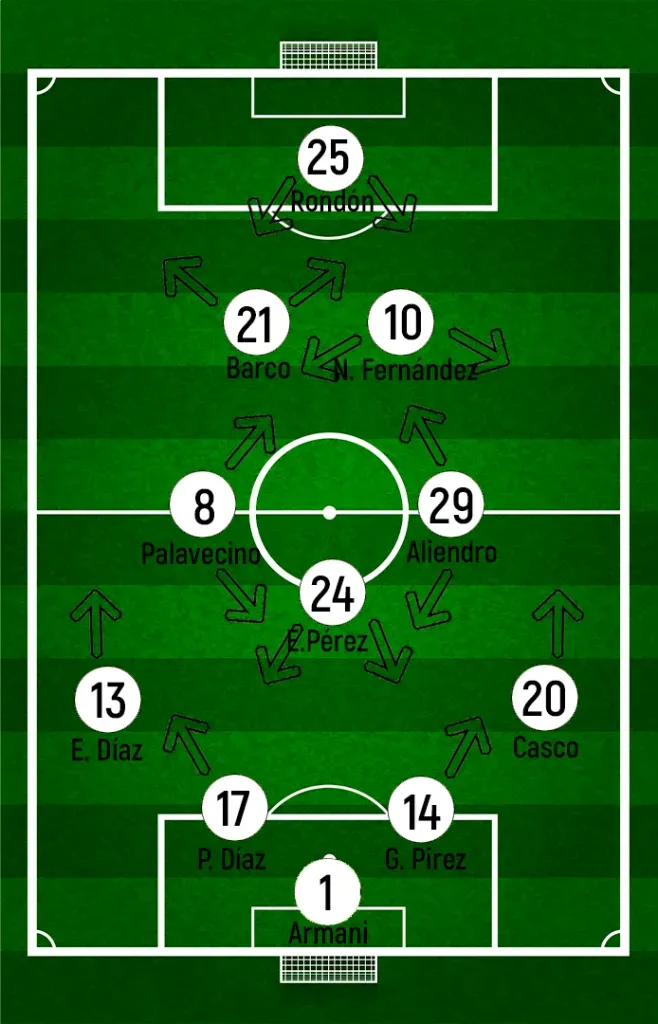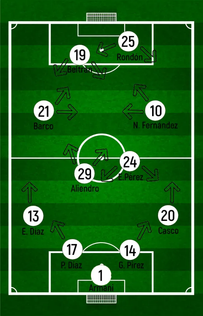 En el fútbol moderno se cree que una gambeta o un firulete por demás es lo más vistoso, y realmente no hay nada más estético que el fútbol correcto y bien jugado. Aliendro es bandera de esto, sabiendo siempre qué hacer, cómo hacerlo, cuándo hacerlo y dónde hacerlo. Ya no solo mejora a Enzo Pérez, sino que lo hace competir por quien juega mejor.