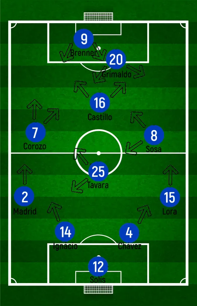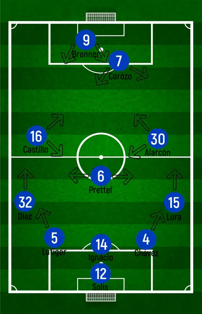 Este esquema sorprendió a la visita, que esperaba un River mucho más defensivo y siendo menos protagonista. Intentando tomar la conducción del partido, su DT cambió el esquema por un 4-3-1-2 que le dé más poder en el medio y libertad a Corozo para proponer 1vs1. Sin embargo, ninguna entrada aportó juego al equipo peruano que se fue desinflando de a poco.