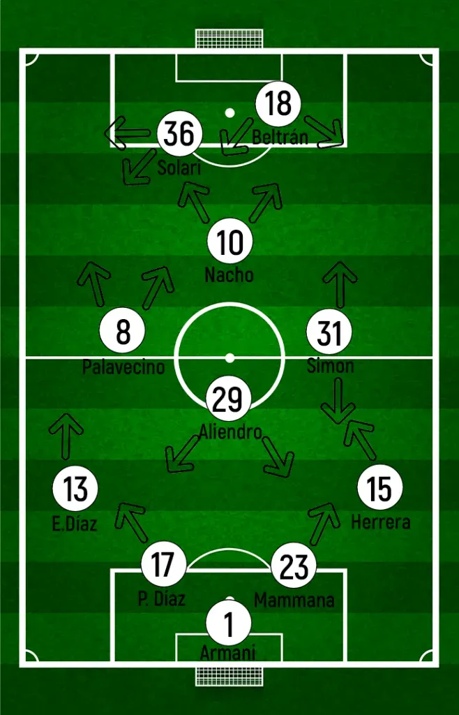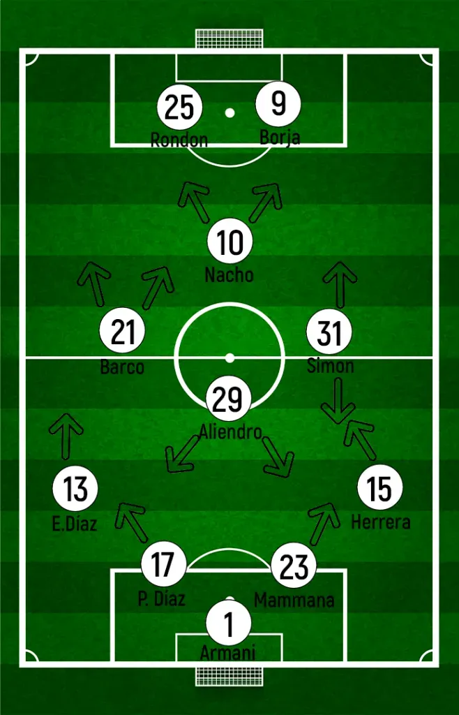 Demichelis, en cambio, buscó primero cambiar funciones en el medio con Simón y Nacho por Enzo Pérez y Paradela. El 10 de River entraría con funciones diferentes a José, y se mostraría mucho más cómodo por detrás de los atacantes.