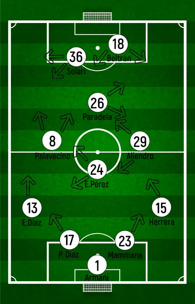 Con estas entradas, River buscaría ser protagonista en ese primer tiempo y generar peligro con alguna corrida de Paradela o Solari por los costados. Sin embargo, estos no pudieron interpretar bien sus funciones en cancha y se los vio muy incómodos.
