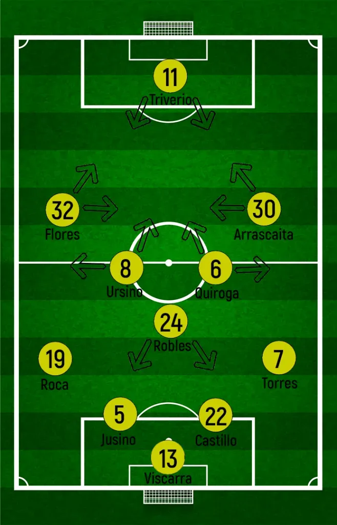 Por su lado, el local planteaba un 4-2-3-1. Centrales estáticos, buscando que Beltrán no entre con comodidad en el área, laterales de diferentes roles y un medio de mucho juego. Isnaldo tendría libertad para atacar sin compañía de su lateral en el sector izquierdo, Chura buscaría asociarse con Ortega y arriba, un 9 pivot como Triverio.