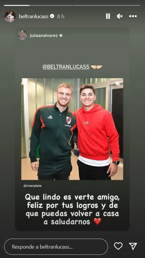 “Que lindo es verte amigo, feliz por tus logros y de que puedas volver a casa a saludarnos”, compartió en una de sus historias el delantero de River que anotó ante Colón. Lo hizo con una foto de la previa del partido que se sacó con su amigo. Beltrán y Julián se criaron en River y compartieron Inferiores pese a que Álvarez sea categoría 2000 y Beltrán 2001.