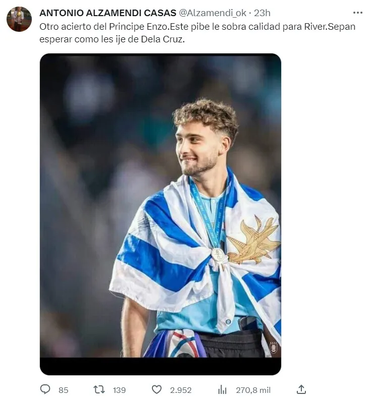 Quien se hizo eco de la posible llegada de Sebastián Boselli a River es Antonio Alzamendi, gloria riverplatense y autor del gol ante Steaua Bucarest para que el Más Grande gané la Intercontinental de 1986. El ex atacante es activo en las redes sociales y allí suele comentar sobre el presente de River y también recibe el cariño de los hinchas. En las últimas horas publicó en Twitter: “Otro acierto del Príncipe Enzo. A este pibe le sobra calidad para jugar en River. Sepan esperar como les dije con De La Cruz”.