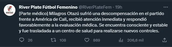River vivió momentos de angustia en la tarde del sábado mientras el equipo femenino disputaba el partido por el tercer puesto de la Women’s Cup ante el América de Cali en la ciudad española de Madrid. Cuando el partido iba 0 a 0, Milagros Otazú, lateral izquierdo de las Millonarias, se descompensó en pleno campo de juego y el partido tuvo que ser detenido.