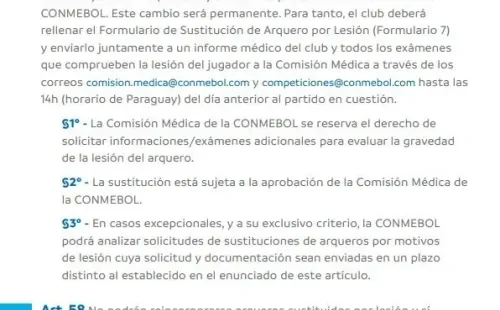 Según el artículo 57 del reglamento correspondiente a la presente edición de la Libertadores, “se podrá permitir la sustitución de un arquero lesionado durante cualquier etapa de la disputa del torneo, una vez que la gravedad de la lesión haya sido comprobada y certificada por la Comisión Médica de la Conmebol”. En síntesis, si hay una urgencia, existe una excepción que acompaña el sentido común.