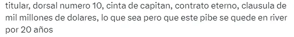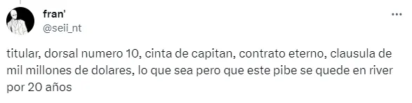 Con tuits en donde se pedía que le renueven el contrato cuanto antes o que se suba la cláusula de rescisión de manera urgente para evitar que se lo lleven desde Europa, los fanáticos del Millonario dejaron bien en claro que pretenden ver al enganche por mucho tiempo con la banda.