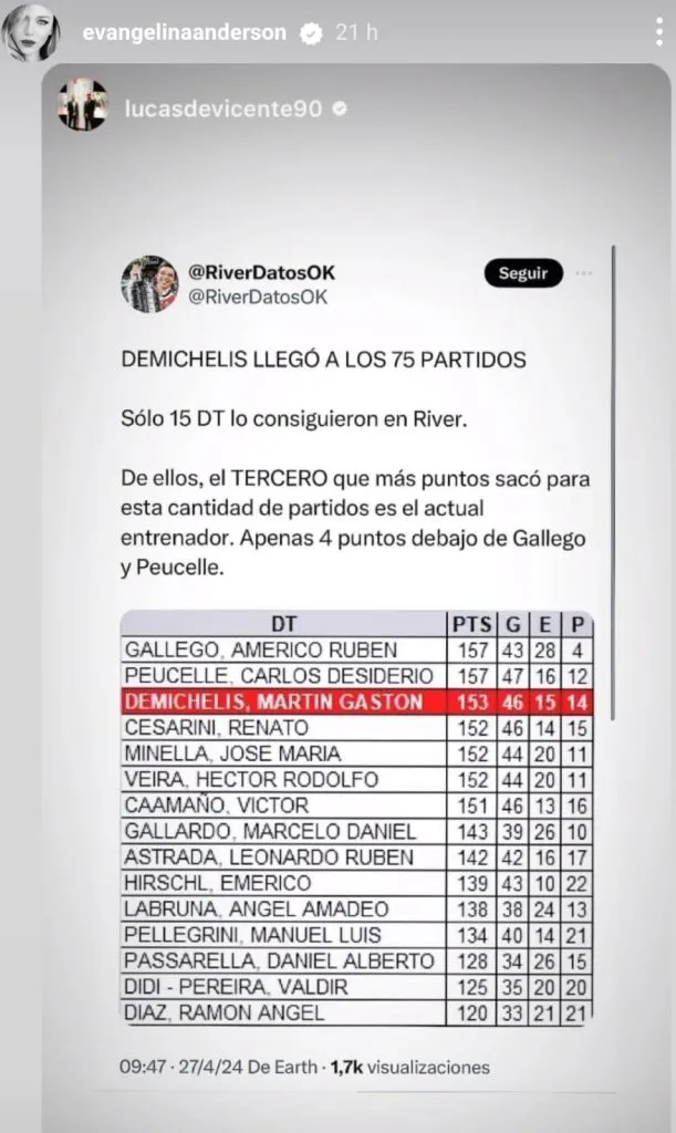 Sin embargo, decidida a silenciar estas críticas, Evangelina Anderson salió a bancar a su esposo con un dato que demuestra que el andar de River, al menos desde los números, no es nada malo ya que este grafica a Demichelis como el tercer DT con más puntos en 75 dirigidos.