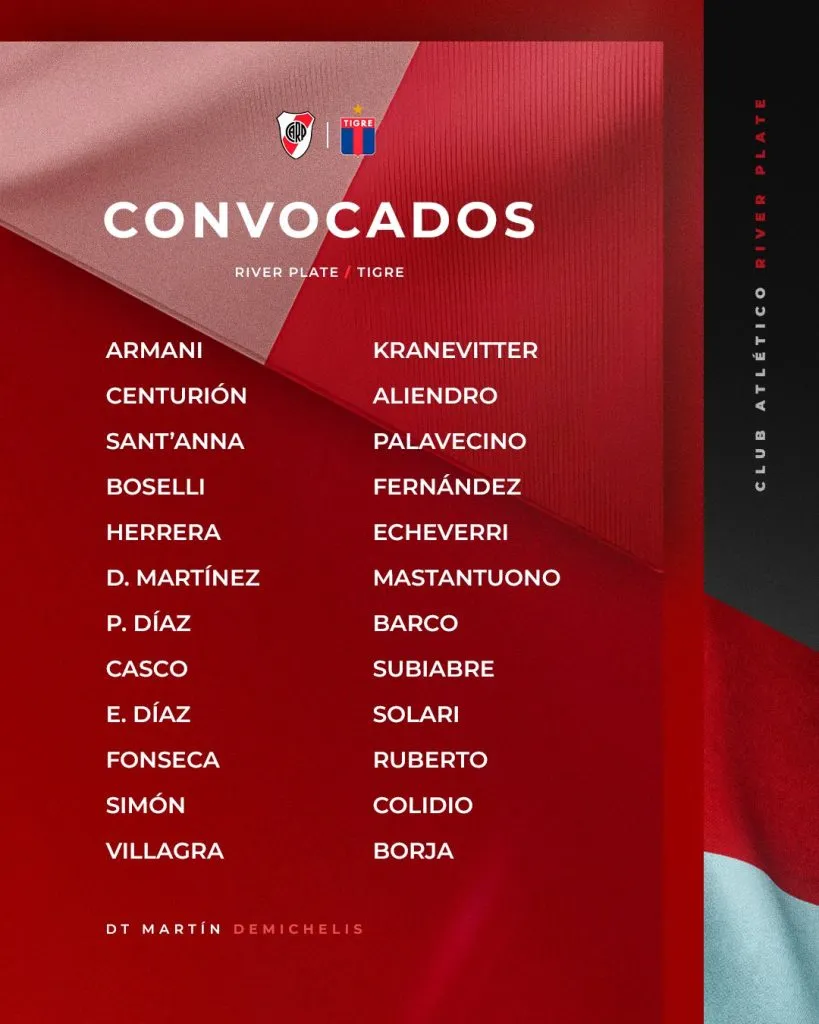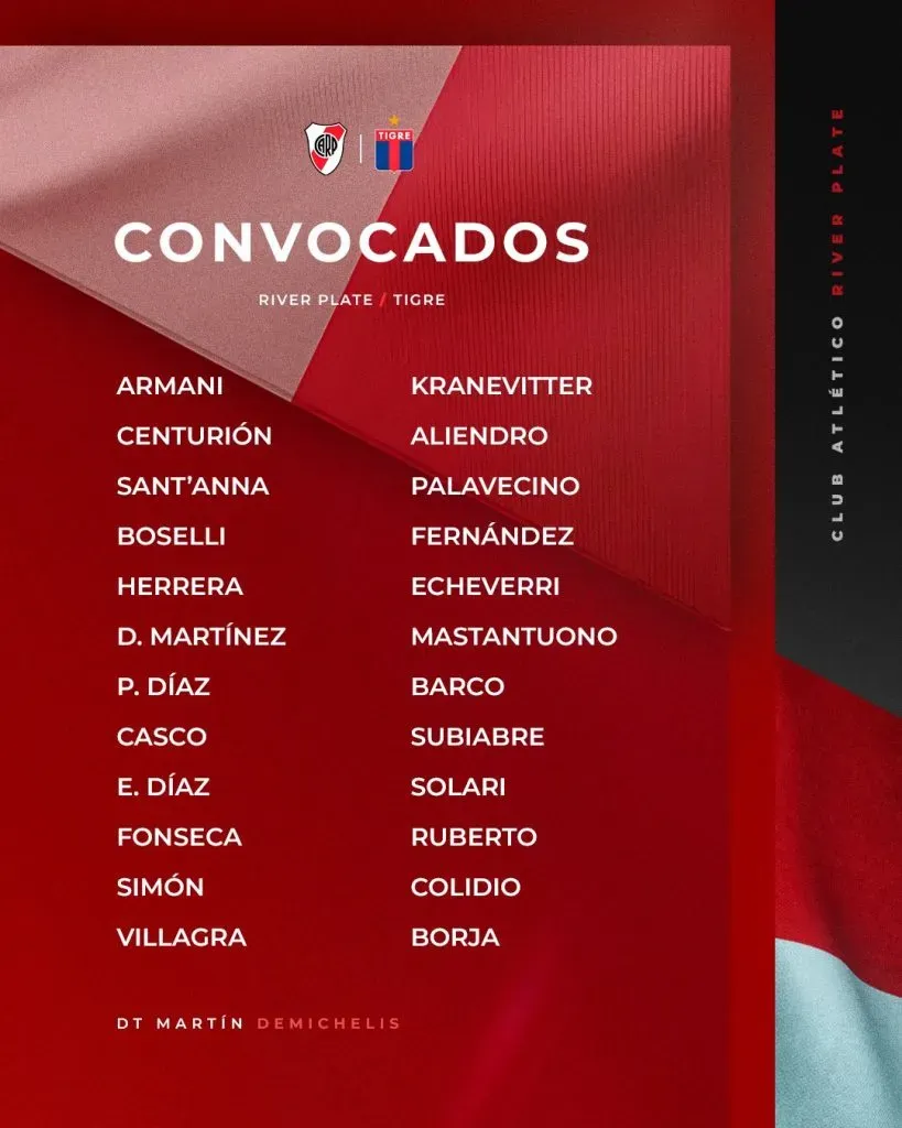 El probable once de River vs. Tigre en el Monumental: Franco Armani; Agustín Sant’Anna, Sebastián Boselli, Paulo Díaz, Milton Casco; Matías Kranevitter, Rodrigo Villagra o Nicolás Fonseca, Esequiel Barco; Claudio Echeverri; Facundo Colidio y Miguel Borja.