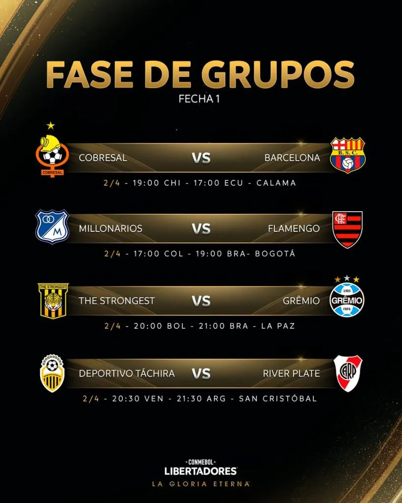 Luego de confirmar los días y horarios de toda la fase de grupos, Conmebol anunció en las últimas horas un cambio para el debut de River en la Copa Libertadores. El encuentro frente a Deportivo Táchira, programado inicialmente para el martes 2 de abril a las 21 horas de Argentina (una hora menos en Venezuela), finalmente se corrió media hora y pasó para las 21.30 horas.