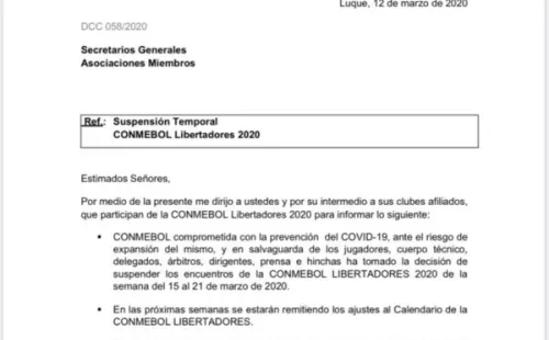 La máxima entidad del fútbol sudamericano decidió que los encuentros de la tercera fecha del certamen continental no se lleven a cabo la semana que viene, como había sido programado. Esta resolución obedece a la medida de evitar que continúe propagándose el coronavirus, declarado como una pandemia por la Organización Mundial de la Salud.