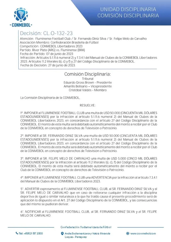 Además, Conmebol estableció una advertencia tanto al club Fluminense como a Felipe Melo de Carvalho: en caso de reiterarse cualquier infracción a la disciplina deportiva de igual o similar naturaleza, se le aplicará el artículo 27 del Código Disciplinario de Conmebol, que podría agravar la sanción del futbolista en cuestión. El polémico defensor brasilero, que viene de afirmar que River es uno de los mejores equipos del continente, ahora deberá mejorar su comportamiento dentro del campo de juego si no quiere sufrir un castigo más severo.