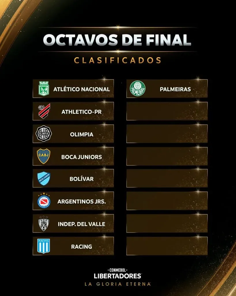 ¿Quiénes son los equipos clasificados? Hasta aquí hay 3 representantes de nuestro país (Argentinos Jrs, Racing y Boca), 2 de Brasil (Athletico Paranaense y Palmeiras), 1 de Colombia (Atlético Nacional), 1 de Paraguay (Olimpia), 1 de Bolivia (Bolívar) y 1 de Ecuador (Independiente del Valle). Todavía resta la definición de los otros siete clasificados para completar el cuadro de octavos.