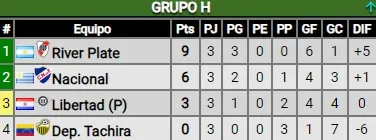 La única combinación que clasificará matemáticamente a River a octavos es ganando ante Nacional y que Libertad no gane en Venezuela, ya que de esa forma los paraguayos quedarán sin chances numéricas de poder alcanzar al Millonario. Cabe destacar que luego River tendrá dos partidos seguidos de local para cerrar el grupo, primero ante Libertad y finalmente frente a Táchira.