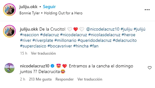“Entramos a la cancha el domingo juntos ?? Delacrucita jajaja“, fue el comentario que dejó DLC en la publicación, siguiendo la línea del apodo tierno que Juli le puso a él. Queremos creer que la invitación va a ser aceptada…