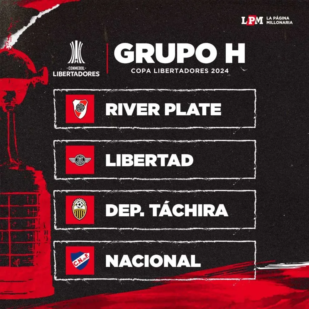 Los nervios ya se transformaron en ansiedad y expectativa. Se sorteó la fase de grupos de la Copa Libertadores 2024 y River ya conoce a cada uno de sus rivales: el Millonario enfrentará a Libertad de Paraguay, Deportivo Táchira de Venezuela y Nacional de Uruguay, siendo cabeza de serie del Grupo H. A priori, una zona que cayó bien en Nuñez.