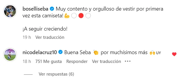 Un detalle para nada menor fue el gesto que tuvo Nicolás De La Cruz con Sebastián Boselli tras su debut con el Manto Sagrado el pasado sábado ante Universidad Católica en San Nicolás. El central compartió una publicación en su cuenta de Instagram en la que expresaba su felicidad por su estreno en River y Nicolás De La Cruz -que está concentrado con la Selección de Uruguay- se la comentó: “Buena, Seba. Por muchísimos más”.