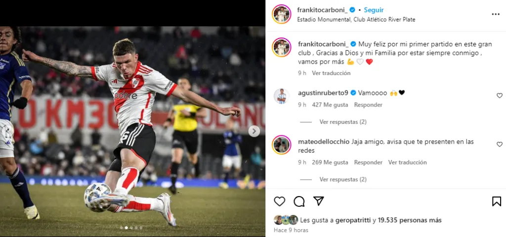 Terminado el partido, Carboni no pudo ocultar su felicidad por haber jugado sus primeros minutos en su nuevo club y compartió una publicación en su cuenta de Instagram: “Muy feliz por mi primer partido en este gran club. Gracias a Dios y mi familia por estar siempre conmigo, vamos por más“, escribió el defensor.