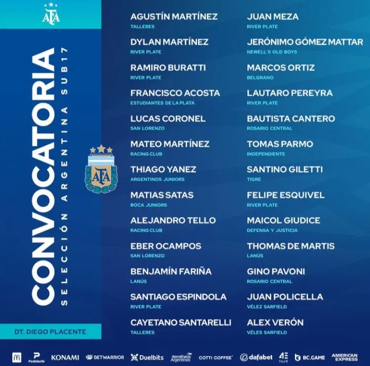 En una una semana de entrenamientos, el entrenador de la Albiceleste decidó citar a seis jugadores de las inferiores del Millo, todos de la categoría 2008 de River: los arqueros Dylan Martínez y Ramiro Burratti, el mediocampista central Santiago Espíndola, los mediocampista ofensivos Juan Cruz Meza y Lautaro Pereyra, y el delantero Felipe Esquivel.
