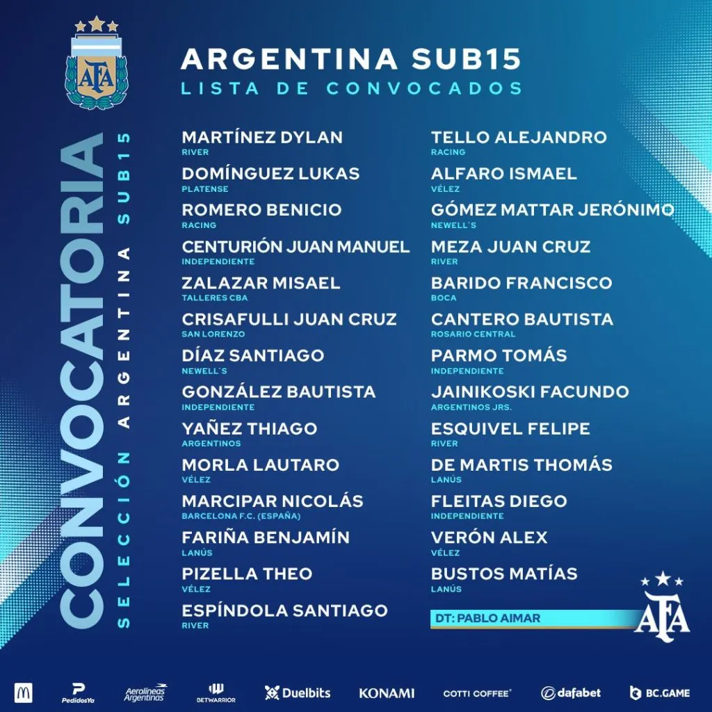 El Payasito, de glorioso pasado como jugador del Millonario, hizo pública la nómina de convocados para los preparativos del Sudamericano Sub 15 y en dicha lista aparecen cuatro jugadores del Más Grande: se trata de Dylan Martínez, Santiago Espíndola, Juan Cruz Meza y Felipe Esquivel. El Sudamericano Sub 15 será en Bolivia entre el 17 de noviembre y el 3 de diciembre.