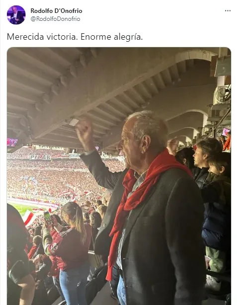 Este domingo D’Onofrio volvió al Monumental y alentó al equipo de Martín Demichelis desde uno de los palcos de la platea San Martín media. Y más allá de no creer en el poder que tienen las prendas y los rituales, el ex directivo de River asistió al superclásico con el suéter rojo sobre sus hombros. Rodolfo compartió una foto en la tribuna con el pullover y un breve texto: “Merecida victoria. Enorme alegría“. Los hinchas se volvieron locos y le agradecieron por cumplir con el pedido.