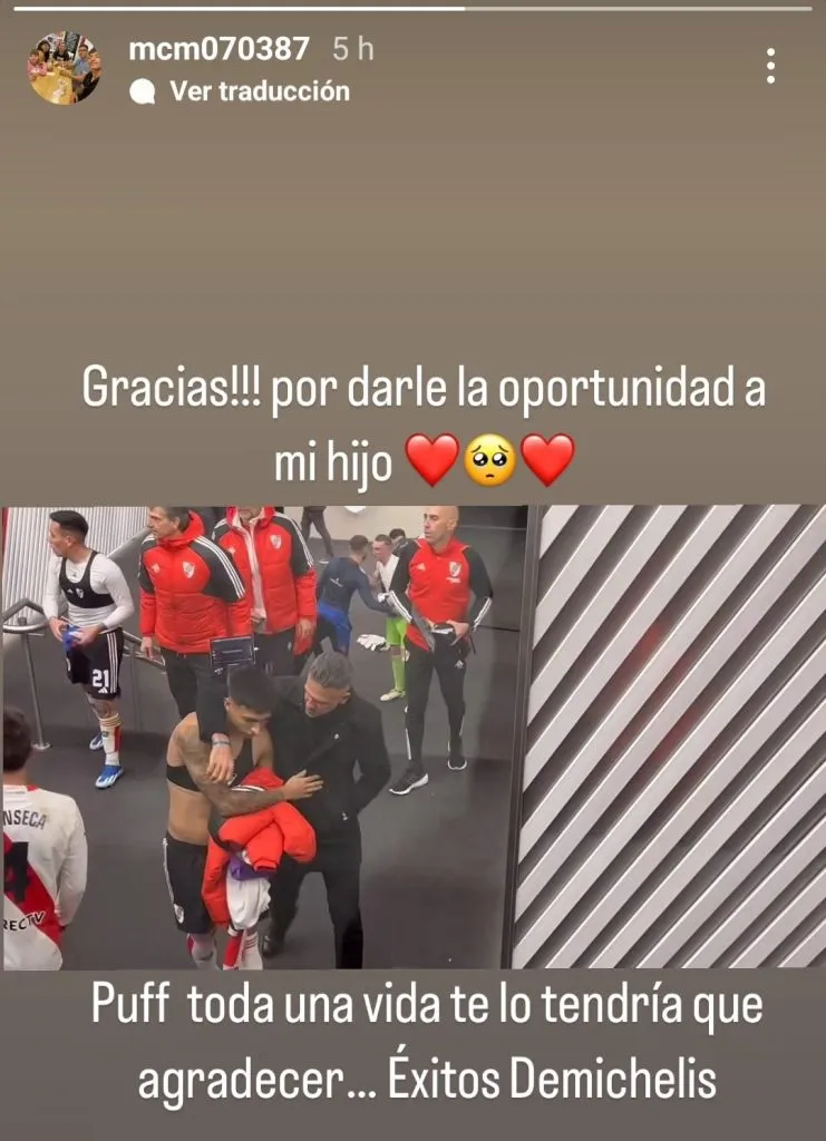 Incluso, el posteo en Instagram tuvo algunas palabras más de agradecimiento para Demichelis: “Puff toda una vida te lo tendría que agradecer… Éxitos Demichelis”, cerró la mamá del goleador en un pensamiento que cada vez es más habitual en los hinchas del Millonario.