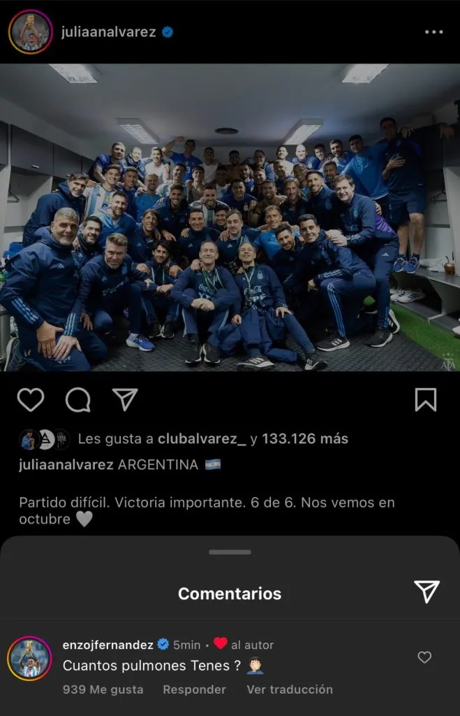 Tras la importantísima victoria en la altura de La Paz, llegaron los abrazos, los festejos en el vestuario y una foto grupal en el Hernando Siles que desató un divertido intercambio entre Enzo y Julián en las redes sociales. “Partido difícil. Victoria importante. 6 de 6. Nos vemos en octubre”, posteó la Araña Álvarez en un mensaje dedicado a los hinchas argentinos. Uno de los primeros en responder fue Enzo Fernández, que un poco en chiste y un poco en serio, le hizo la pregunta del millón: ¿Cuántos pulmomes tenés, Julián?”.