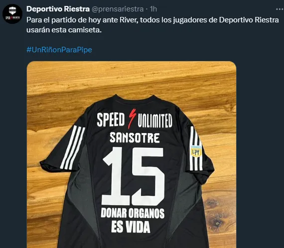 Por este motivo, Riestra decidió que todos los futbolistas que actúen hoy ante River utilicen una camiseta especial con el nombre de Sansotre en la espalda, el número 15 que es su dorsal y la frase “donar órganos salva vidas” en la parte baja de la camiseta.